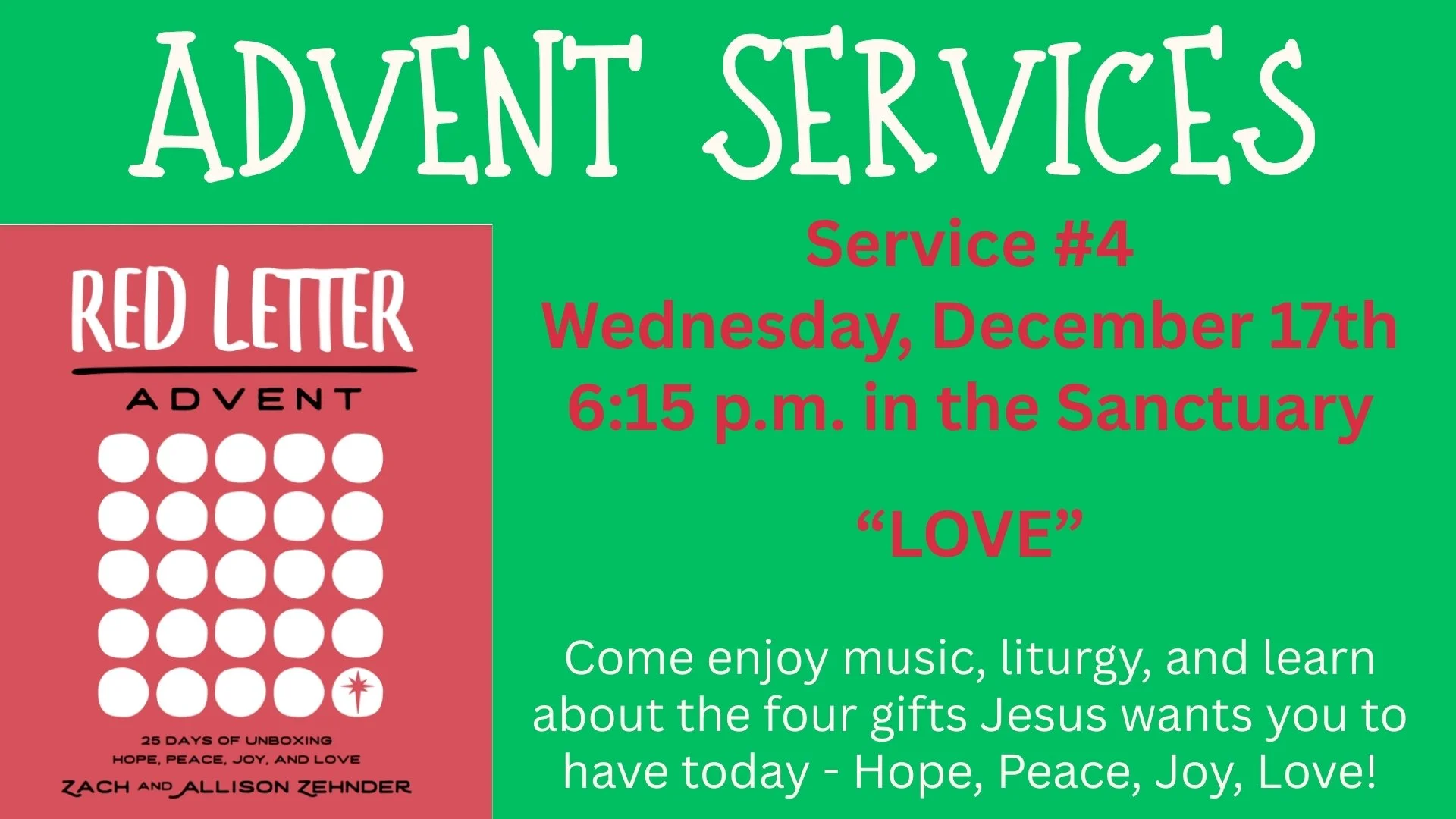 This year’s Advent services will begin on Wednesday, November 19, at 6:15 p.m. in the Sanctuary. The services will include songs and liturgy as well as the message from the “Red Letter” Advent study by Zach and Allison Zehnder and RightNow Media.